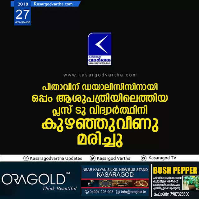 പിതാവിന് ഡയാലിസിസിനായി ഒപ്പം ആശുപത്രിയിലെത്തിയ പ്ലസ് ടു വിദ്യാര്ത്ഥിനി കുഴഞ്ഞുവീണു മരിച്ചു