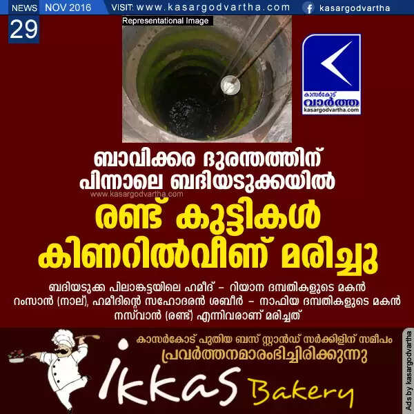 ബദിയടുക്ക: (www.kasargodvartha.com 29/11/2016) ബാവിക്കരയില്‍ രണ്ട് വിദ്യാര്‍ത്ഥികള്‍ പുഴയില്‍ മുങ്ങിമരിച്ചതിന്റെ ദുരന്തത്തിന്റെ ഞെട്ടല്‍ വിട്ടുമാറുന്നതിന് മുമ്പ് ബദിയടുക്കയില്‍ രണ്ട് പിഞ്ചുകുട്ടികള്‍ കിണറില്‍വീണ് മരിച്ചു. ബദിയടുക്ക പിലാങ്കട്ടയിലെ ഹമീദ് - റിയാന ദമ്പതികളുടെ മകന്‍ റംസാന്‍ (നാല്), ഹമീദിന്റെ സഹോദരന്‍ ശബീര്‍ - നാഫിയ ദമ്പതികളുടെ മകന്‍ നസ്‌വാന്‍ (രണ്ട്) എന്നിവരാണ് മരിച്ചത്.