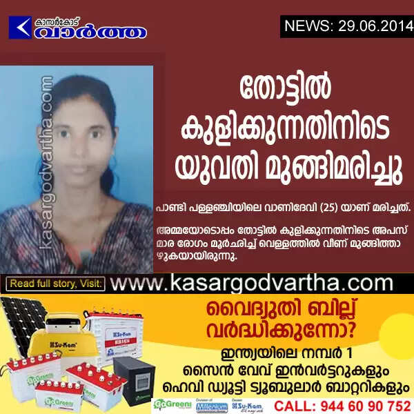 മുള്ളേരിയ: (www.kasargodvartha.com 29.06.2014) തോട്ടില് കുളിക്കുന്നതിനിടെ യുവതി മുങ്ങിമരിച്ചു. പാണ്ടി പള്ളഞ്ചിയിലെ മുങ്ങത്ത് ദാമോദരന് നായരുടെ മകള് വാണിദേവി (25) യാണ് മരിച്ചത്.