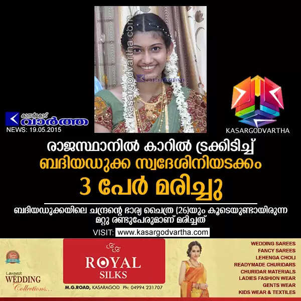 രാജസ്ഥാനില് കാറില് ട്രക്കിടിച്ച് ബദിയഡുക്ക സ്വദേശിനിയടക്കം 3 പേര് മരിച്ചു