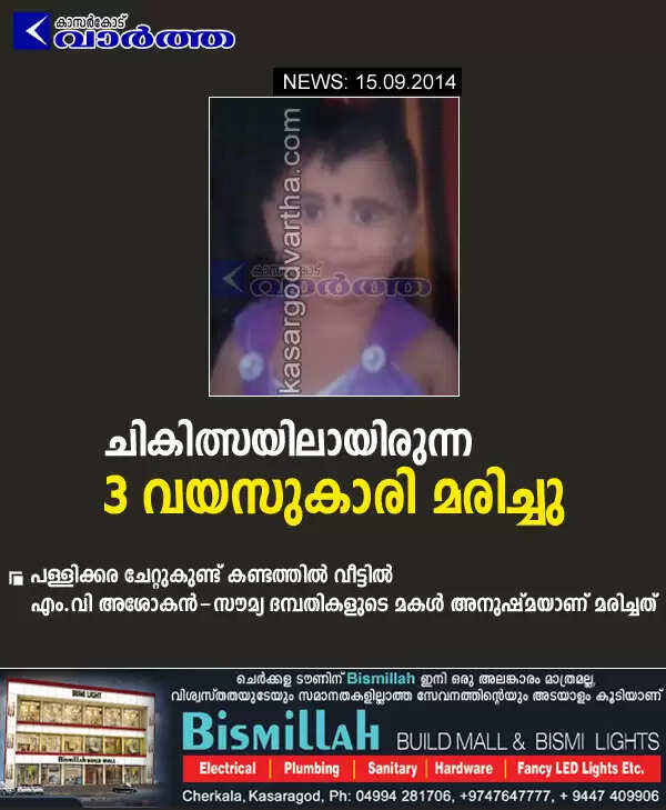 പള്ളിക്കര: (www.kasargodvartha.com 15.09.2014) അസുഖത്തെ തുടര്‍ന്ന് ചികിത്സയിലായിരുന്ന മൂന്നു വയസുകാരി മരിച്ചു. ചേറ്റുകുണ്ട് കണ്ടത്തില്‍ വീട്ടില്‍ എം.വി അശോകന്‍ - സൗമ്യ ദമ്പതികളുടെ മകള്‍ അനുഷ്മയാണ് മരിച്ചത്.