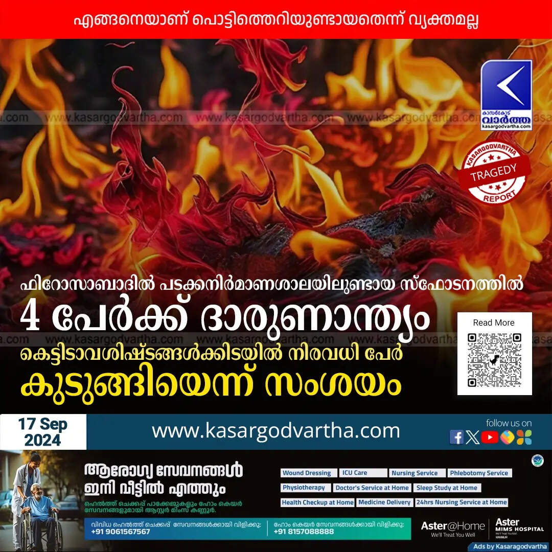 Tragedy | ഫിറോസാബാദില് പടക്കനിര്മാണശാലയിലുണ്ടായ സ്ഫോടനത്തില് 4 പേര്ക്ക് ദാരുണാന്ത്യം; കെട്ടിടാവശിഷ്ടങ്ങള്ക്കിടയില് നിരവധി പേർ കുടുങ്ങിയെന്ന് സംശയം