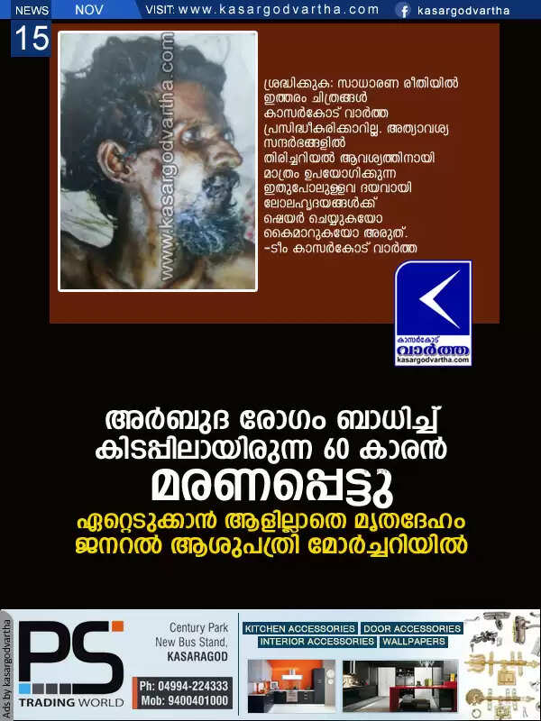 അര്ബുദ രോഗം ബാധിച്ച് കിടപ്പിലായിരുന്ന 60 കാരന് മരണപ്പെട്ടു; ഏറ്റെടുക്കാന് ആളില്ലാതെ മൃതദേഹം ജനറല് ആശുപത്രി മോര്ച്ചറിയില്