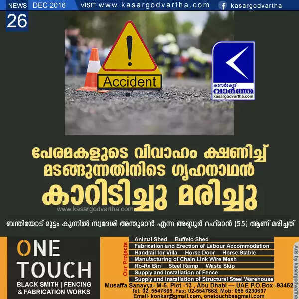 Keywords: 60 year old dies in accident, Accident, Death, Obituary, Injured, Kerala, Kumbala