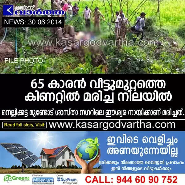 നെല്ലിക്കട്ട: (www.kasargodvartha.com 30.06.2014) 65 കാരനെ വീട്ടുമുറ്റത്തെ കിണറ്റില് മരിച്ച നിലയില് കണ്ടെത്തി. നെല്ലിക്കട്ട മുണ്ടോട് ശാസ്താ നഗറിലെ ഈശ്വര നായിക്കാണ് മരിച്ചത്.