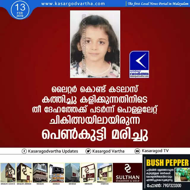 Keywords:  Kasaragod, Kerala, news, Top-Headlines, Death, Obituary, fire, 7 year old died after burn injury
