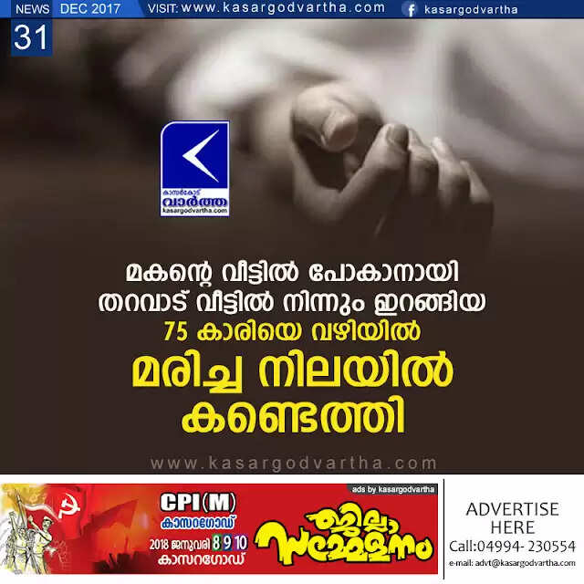മകന്റെ വീട്ടില് പോകാനായി തറവാട് വീട്ടില് നിന്നും ഇറങ്ങിയ 75 കാരിയെ വഴിയില് മരിച്ച നിലയില് കണ്ടെത്തി