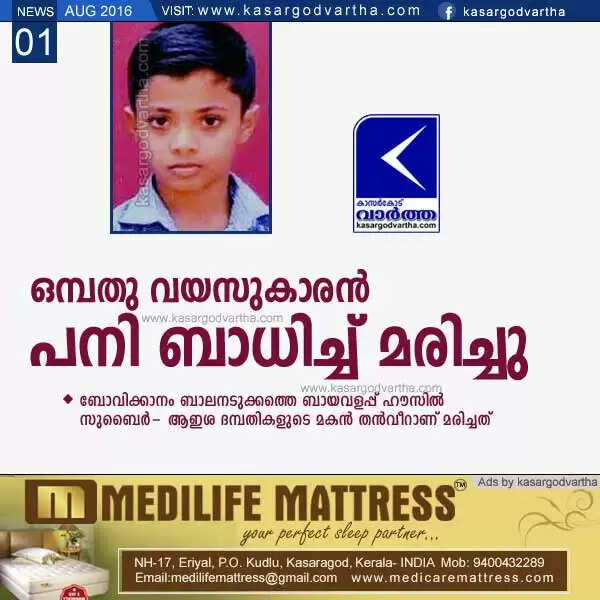 Keywords: Kasaragod, Kerala, Death, Obituary, Fever, Death, hospital, Bovikanam, 9 year old dies after fever.
