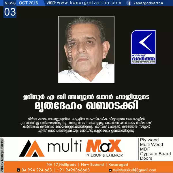തൃക്കരിപ്പൂര്‍: (www.kasargodvartha.com 03/10/2016) ബംഗളൂരുവിലെ വ്യാപാര പ്രമുഖനും ബംഗളൂരു കോര്‍പ്പറേഷന്‍ മുന്‍ കൗണ്‍സിലറുമായ എ ബി അബ്ദുള്‍ ഖാദര്‍ ഹാജി (80) നിര്യാതനായി. തൃക്കരിപ്പൂര്‍ ഉദിനൂര്‍ സ്വദേശിയാണ്. ബംഗളൂരു ശാന്തി നഗറിലായിരുന്നു താമസം.