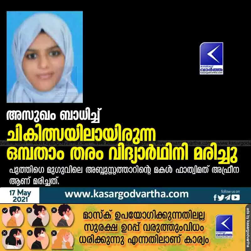 Keywords: Kerala, News, Kasaragod, Badiyadukka, Death, Top-Headlines, Obituary, Student, Treatment, A ninth-grade student who was being treated for an illness has died.