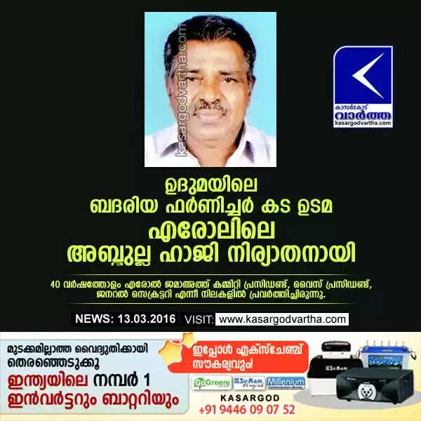 ഉദുമയിലെ ബദരിയ ഫര്ണിച്ചര് ഉടമ എരോലിലെ അബ്ദുല്ല ഹാജി നിര്യാതനായി