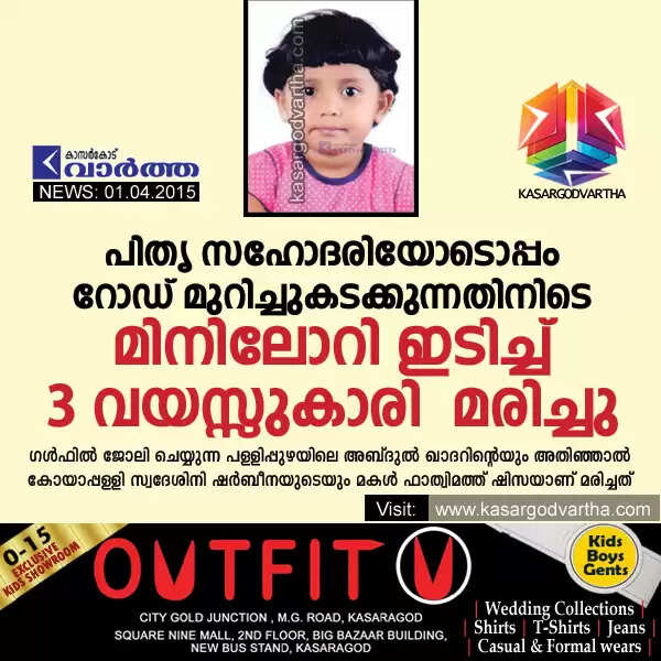 പള്ളിക്കര: (www.kasargodvartha.com 01/04/2015) പിതൃ സഹോദരിയോടൊപ്പം റോഡ് മുറിച്ചുകടക്കുന്നതിനിടെ മിനിലോറി ഇടിച്ച് മൂന്ന് വയസ്സുകാരി മരിച്ചു. ബുധനാഴ്ച ഉച്ചക്ക് 1.30 മണിയോടെ പള്ളിപ്പുഴ ഇസ്‌ലാമിക് ഇംഗ്ലീഷ് മീഡിയം നേഴ്‌സറി സ്‌കൂളിന് മുന്നില്‍ വെച്ചാണ് അപകടമുണ്ടായത്. ഗള്‍ഫില്‍ ജോലി ചെയ്യുന്ന പള്ളിപ്പുഴയിലെ അബ്ദുല്‍ ഖാദറിന്റെയും അതിഞ്ഞാല്‍ കോയാപ്പള്ളി സ്വദേശിനി ഷര്‍ബീനയുടെയും മകള്‍ ഫാത്വിമത്ത് ഷിസയാണ് മരിച്ചത്.