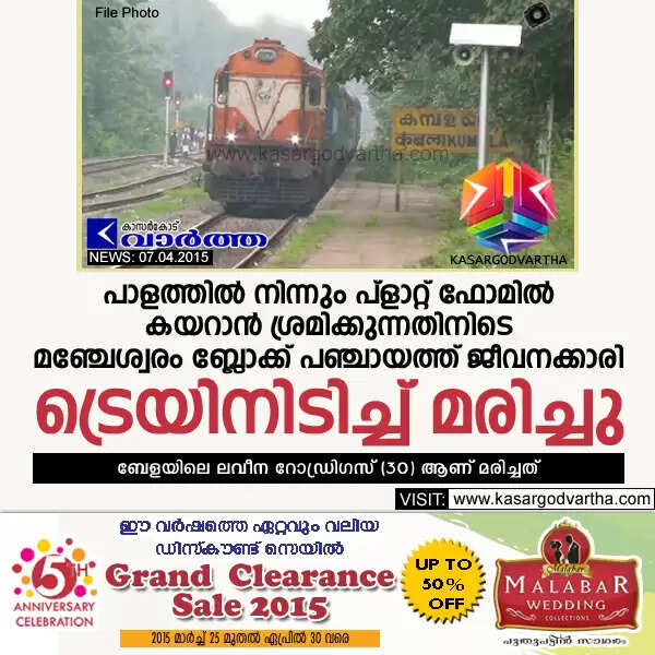 പാളത്തില് നിന്നും പ്ളാറ്റ് ഫോമില് കയറാന് ശ്രമിക്കുന്നതിനിടെ മഞ്ചേശ്വരം ബ്ലോക്ക് പഞ്ചായത്ത് ജീവനക്കാരി ട്രെയിനിടിച്ച് മരിച്ചു