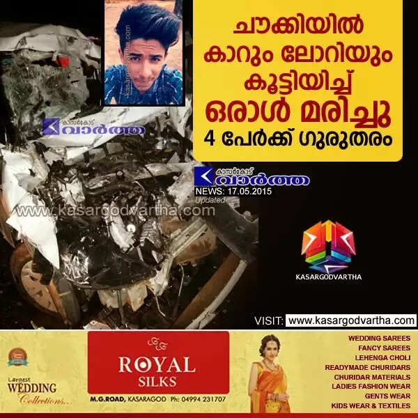 ചൗക്കിയില്‍ കാറും ലോറിയും കൂട്ടിയിച്ച് ഒരാള്‍ മരിച്ചു; 4 പേര്‍ക്ക് ഗുരുതരം