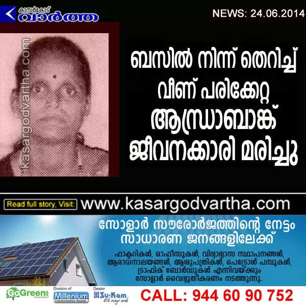 Keywords : Woman, Died, Bus, Kerala, Kasaragod, Obituary, Injured, Hospital, Sumalatha.