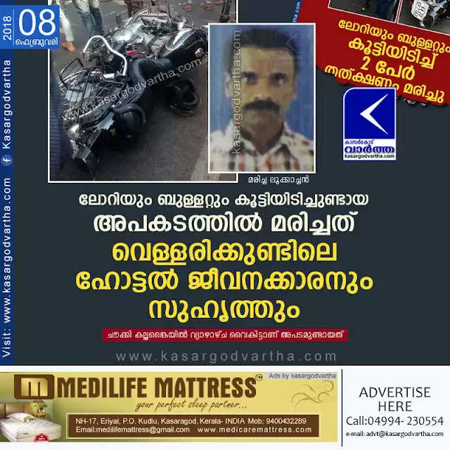 ലോറിയും ബുള്ളറ്റും കൂട്ടിയിടിച്ചുണ്ടായ അപകടത്തില് മരിച്ചത് വെള്ളരിക്കുണ്ടിലെ ഹോട്ടല് ജീവനക്കാരനും സുഹൃത്തും