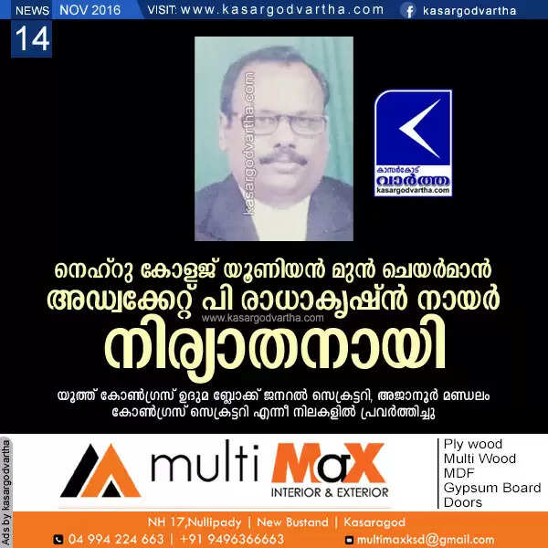 Keywords: Kanhangad, Kasaragod, Obituary, Advocate P Radhakrishnan Nair, Advocate P Radhakrishnan Nair passes away