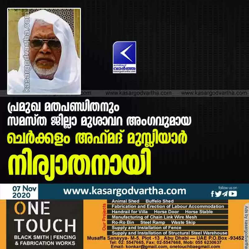 കാസര്‍കോട്: (www.kasargodvartha.com 07.11.2020) സമസ്ത കേരള ജംഇയ്യത്തുല്‍ ഉലമ ജില്ലാ മുശാവറ അംഗവും പ്രമുഖ പണ്ഡിതനുമായ ചെര്‍ക്കളം കമാലിയ ഹൗസിലെ അഹ് മദ് മുസ്ലിയാര്‍ (78) നിര്യാതനായി. മലബാര്‍ ഇസ്ലാമിക് കോപ്ലക്സ് (എം ഐ സി) വൈസ് പ്രസിഡണ്ട്, കണ്ണിയത്ത് ഇസ്ലാമിക് അകാദമി വൈസ് പ്രസിഡണ്ട്, കാസര്‍കോട് സംയുക്ത ജമാഅത്ത് കമ്മിറ്റി അംഗം, എസ് എം എഫ് മണ്ഡലം പ്രസിഡണ്ട്, ജംഇയ്യത്തുല്‍ ഉലമ മണ്ഡലം ട്രഷറര്‍ എന്നീ സ്ഥാനങ്ങളില്‍ പ്രവര്‍ത്തിച്ചിരുന്നു.