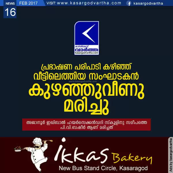 കാഞ്ഞങ്ങാട്: (www.kasargodvartha.com 16/02/2017) പ്രഭാഷണ പരിപാടി കഴിഞ്ഞ് വീട്ടിലെത്തിയ സംഘാടകന് കുഴഞ്ഞുവീണു മരിച്ചു. കാഞ്ഞങ്ങാട്ട് നടന്നു വരുന്ന ഹദിയ അതിഞ്ഞാല് പ്രഭാഷണ പരമ്പരയുടെ ഗള്ഫ് കോ-ഓര്ഡിനേറ്റര്, അജാനൂര് ഇഖ്ബാല് ഹയര്സെക്കന്ഡറി സ്കൂളിനു സമീപത്തെ പി.വി.ബഷീര് (49) ആണ് മരിച്ചത്.