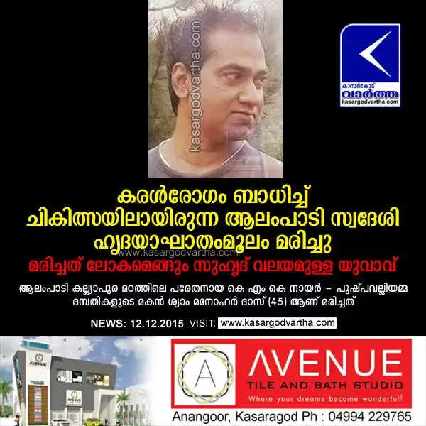 കാസര്കോട്: (www.kasargodvartha.com 12/12/2015) കരള്രോഗം ബാധിച്ച് ചികിത്സയിലായിരുന്ന ആലംപാടി സ്വദേശി ഹൃദയാഘാതംമൂലം മംഗളൂരു ആശുപത്രിയില്വെച്ച് മരിച്ചു. ആലംപാടി കല്ല്യാപുര മഠത്തിലെ പരേതനായ കെ എം കെ നായര് - പുഷ്പവല്ലിയമ്മ ദമ്പതികളുടെ മകന് ശ്യാം മനോഹര് ദാസ് (45) ആണ് മരിച്ചത്.