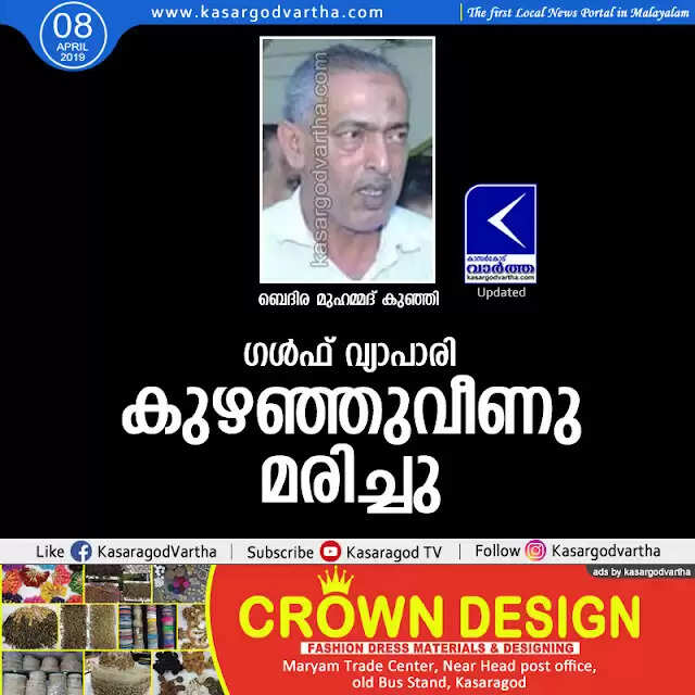 കാസര്കോട്: (www.kasargodvartha.com 08.04.2019) ഗള്ഫ് വ്യാപാരി കുഴഞ്ഞുവീണു മരിച്ചു. അണങ്കൂര് ബെദിരയിലെ മുഹമ്മദ് കുഞ്ഞി ഹാജി (58) ആണ് മരിച്ചത്. ഹൃദയസംബന്ധമായ അസുഖത്തെ തുടര്ന്ന് കൊച്ചി അമൃത ആശുപത്രിയില് വിദഗ്ദ്ധ ചികിത്സക്കെത്തിയതായിരുന്നു. ഡോക്ടറെ കാണിച്ച ശേഷം ഹോട്ടലില് വിശ്രമിക്കുന്നതിനിടെ ദേഹാസ്വാസ്ഥ്യമുണ്ടാവുകയും ഉടന് തന്നെ തൊട്ടടുത്ത ആശുപത്രിയിലെത്തിച്ചെങ്കിലും തിങ്കളാഴ്ച വൈകിട്ട് 3.30 മണിയോടെ മരണം സംഭവിക്കുകയുമായിരുന്നു. ദുബൈയില് വ്യാപാരിയായിരുന്നു.