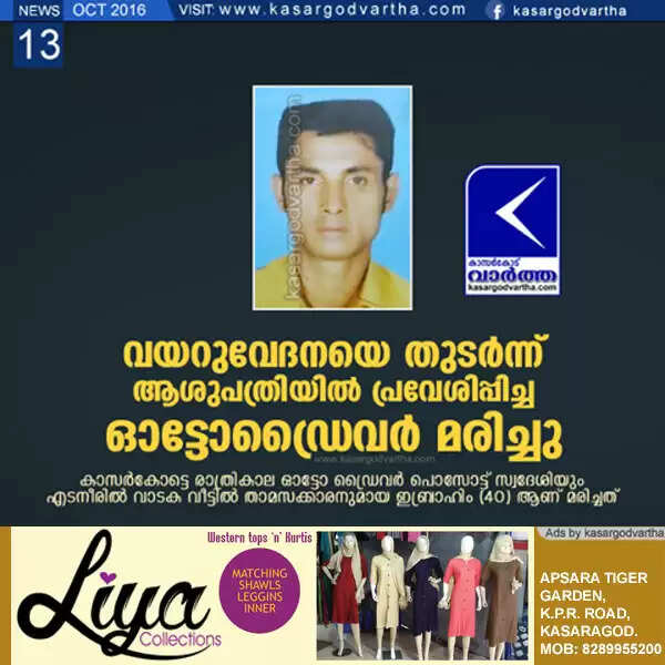 മഞ്ചേശ്വരം: (www.kasargodvartha.com 13/10/2016) വയറുവേദനയെ തുടര്ന്ന് ആശുപത്രിയില് പ്രവേശിപ്പിച്ച ഓട്ടോഡ്രൈവര് മരിച്ചു. കാസര്കോട്ടെ രാത്രികാല ഓട്ടോ ഡ്രൈവര് പൊസോട്ട് സ്വദേശിയും എടനീരില് വാടക വീട്ടില് താമസക്കാരനുമായ ഇബ്രാഹിം (40) ആണ് മരിച്ചത്.