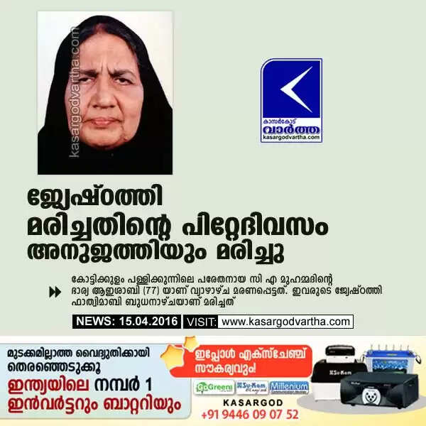 കോട്ടിക്കുളം: (www.kasargodvartha.com 15.04.2016) ജ്യേഷ്ഠത്തി മരിച്ചതിന്റെ പിറ്റേദിവസം അനുജത്തിയും മരിച്ചു. പള്ളിക്കുന്നിലെ പരേതനായ സി എ മുഹമ്മദിന്റെ ഭാര്യ ആഇശാബി (77) യാണ് വ്യാഴാഴ്ച മരണപ്പെട്ടത്. ഇവരുടെ ജ്യേഷ്ഠത്തി നെല്ലിക്കുന്നിലെ ഫാത്വിമാബി ബുധനാഴ്ചയാണ് മരിച്ചത്.