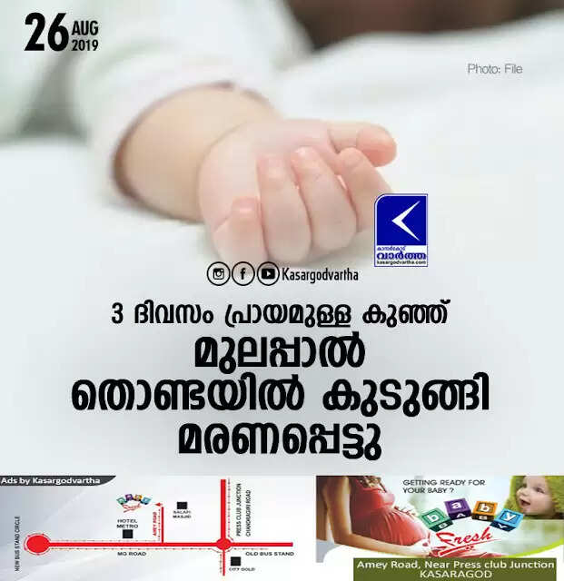 Keywords:  Kasaragod, Kerala, news, Death, Obituary, Baby, Top-Headlines, Baby died after milk trapped in Throat