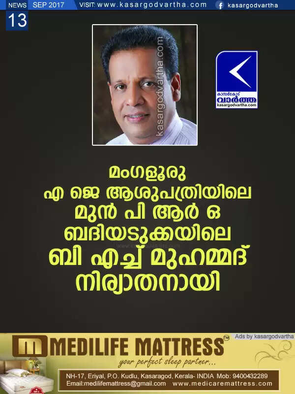 മംഗളൂരു എ ജെ ആശുപത്രിയിലെ മുന് പി ആര് ഒ ബദിയടുക്കയിലെ ബി എച്ച് മുഹമ്മദ് നിര്യാതനായി