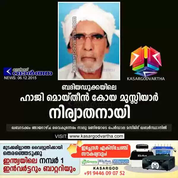 ബദിയഡുക്കയിലെ ഹാജി മൊയ്തീന്‍ കോയ മുസ്ലിയാര്‍ നിര്യാതനായി