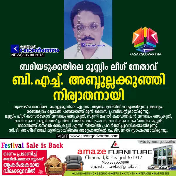 ബദിയടുക്കയിലെ മുസ്ലിം ലീഗ് നേതാവ് ബി.എച്ച്. അബ്ദുല്ലക്കുഞ്ഞി നിര്യാതനായി