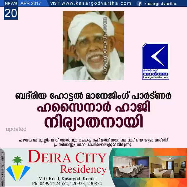 Keywords: kasaragod, Obituary, news, Death, Hasainar Haji, Badriya Hotel, Kerala, Chengala, Partner, Muslim League leader, Badriya hotel managing partner Hasainar Haji passed away.