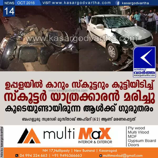ഉപ്പളയില് കാറും സ്കൂട്ടറും കൂട്ടിയിടിച്ച് സ്കൂട്ടര് യാത്രക്കാരന് മരിച്ചു; കൂടെയുണ്ടായിരുന്ന ആള്ക്ക് ഗുരുതരം