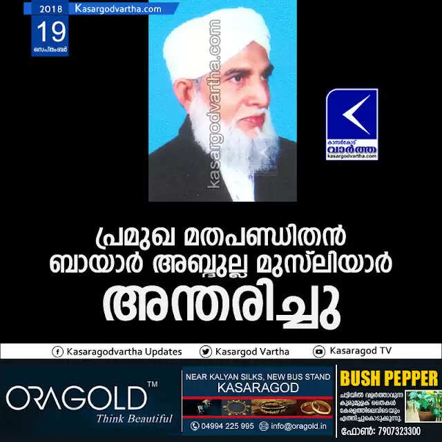 Keywords: Bayar Abdulla Musliyar passes away, Kasaragod, News, Bayar, Obituary, Obit News