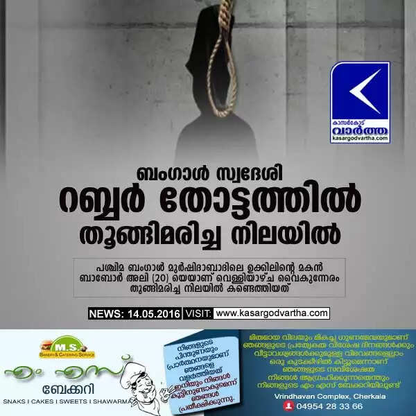 രാജപുരം: (www.kasargodvartha.com 14.05.2016) ബംഗാള്‍ സ്വദേശിയായ യുവാവിനെ റബ്ബര്‍ തോട്ടത്തില്‍ തൂങ്ങിമരിച്ച നിലയില്‍ കണ്ടെത്തി. പശ്ചിമ ബംഗാള്‍ മുര്‍ഷിദാബാദിലെ ഉക്കിലിന്റെ മകന്‍ ബാബോര്‍ അലി (20) യെയാണ് വെള്ളിയാഴ്ച വൈകുന്നേരം തൂങ്ങിമരിച്ച നിലയില്‍ കണ്ടെത്തിയത്.