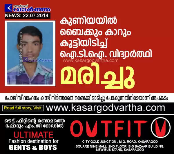 കുണിയയില് ബൈക്കും കാറും കൂട്ടിയിടിച്ച് ഐ.ടി.ഐ വിദ്യാര്ത്ഥി മരിച്ചു