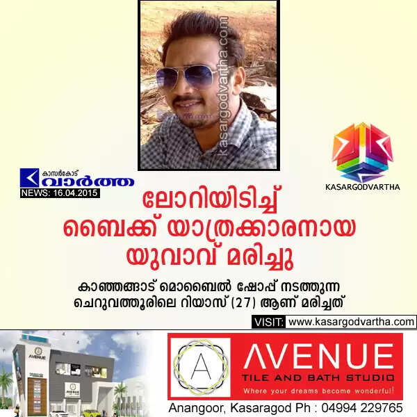 ചെറുവത്തൂര്: (www.kasargodvartha.com 16/04/2015) അമിത വേഗതയിലെത്തിയ നാഷണല് പെര്മിറ്റ് ലോറിയിടിച്ച് ബൈക്ക് യാത്രക്കാരനായ യുവാവ് മരിച്ചു. കാഞ്ഞങ്ങാട് മൊബൈല് ഷോപ്പ് നടത്തുന്ന ചെറുവത്തൂരിലെ റിയാസ് (27) ആണ് മരിച്ചത്. കടയടച്ച് വ്യാഴാഴ്ച രാത്രി 8.30 മണിയോടെ വീട്ടിലേക്ക് പോകുമ്പോള് ചെറുവത്തൂര് കുന്നുമ്മല് പള്ളിക്ക് സമീപത്തുവെച്ച് റിയാസ് സഞ്ചരിച്ച ബൈക്കില് എതിരെവന്ന ലോറി ഇടിക്കുകയായിരുന്നു.