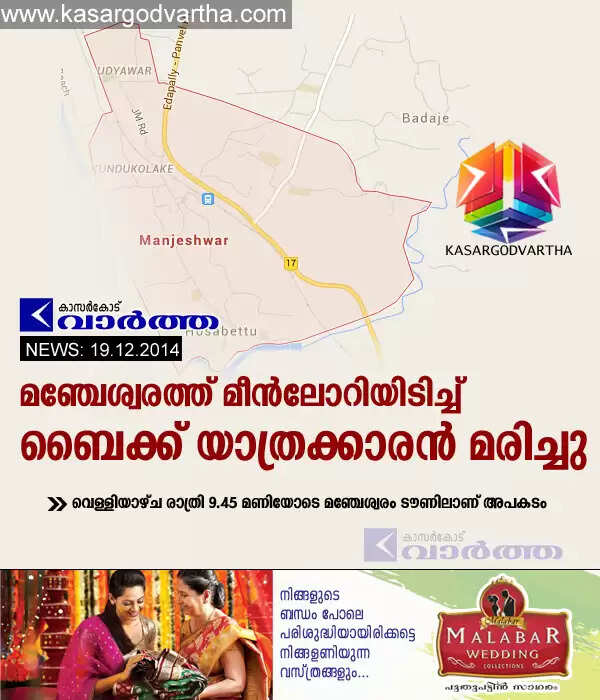 മഞ്ചേശ്വരത്ത് മീന്ലോറിയിടിച്ച് ബൈക്ക് യാത്രക്കാരന് മരിച്ചു