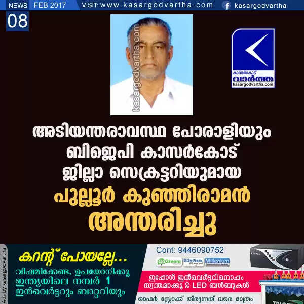 അടിയന്തരാവസ്ഥ പോരാളിയും ബിജെപി കാസര്കോട് ജില്ലാ സെക്രട്ടറിയുമായ പുല്ലൂര് കുഞ്ഞിരാമന് അന്തരിച്ചു