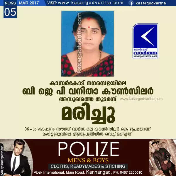 കാസര്‍കോട്: (www.kasargodvartha.com 05/03/2017) കാസര്‍കോട് നഗരസഭയിലെ 36-ാം കടപ്പുറം സൗത്ത് വാര്‍ഡിലെ ബി ജെ പി കൗണ്‍സിലര്‍ കെ പ്രേമ (41) അസുഖത്തെ തുടര്‍ന്ന് മരിച്ചു. മംഗളൂരുവിലെ സ്വകാര്യ ആശുപത്രിയില്‍ ശനിയാഴ്ച രാത്രി 10 മണിയോടെയായിരുന്നു അന്ത്യം.