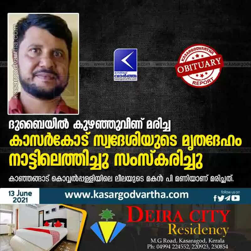 കാഞ്ഞങ്ങാട്: (www.kasargodvartha.com 13.06.2021) ദുബൈയിൽ കുഴഞ്ഞുവീണ് മരിച്ച കാസർകോട് സ്വദേശിയുടെ മൃതദേഹം നാട്ടിലെത്തിച്ചു സംസ്കരിച്ചു. കാഞ്ഞങ്ങാട് കൊവ്വൽപ്പള്ളിയിലെ ലീലയുടെ മകൻ ടി മണി (41) ആണ് മരിച്ചത്.