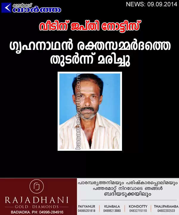 വീടിന് ജപ്തി നോട്ടീസ്; ഗൃഹനാഥന്‍ രക്തസമ്മര്‍ദത്തെ തുടര്‍ന്ന് മരിച്ചു