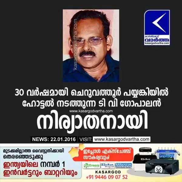 30 വര്ഷത്തിലധികമായി ചെറുവത്തൂര് പയ്യങ്കിയില് ഹോട്ടല് നടത്തുന്ന ടി വി ഗോപാലന് നിര്യാതനായി