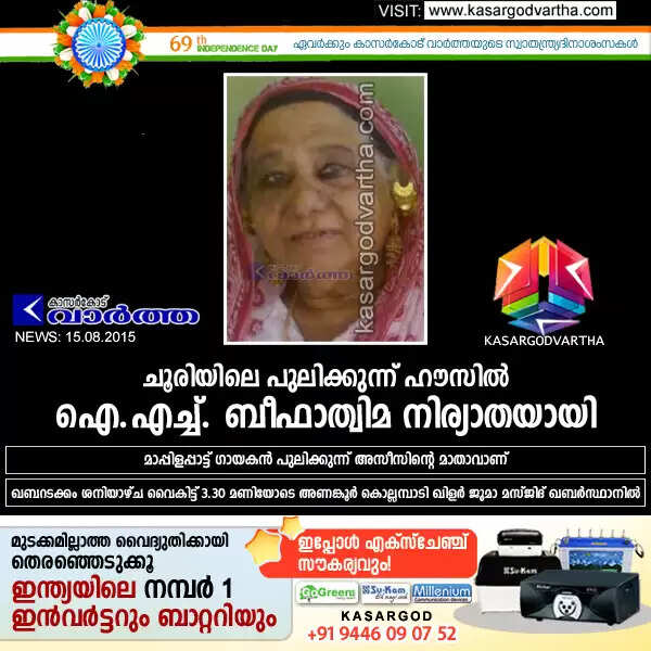 കാസര്‍കോട്: (www.kasargodvartha.com 15/08/2015) ചൂരി ഓള്‍ഡ് മസ്ജിദിന് സമീപത്തെ പരേതനായ ടി.പി. മുഹമ്മദിന്റെ ഭാര്യ പുലിക്കുന്ന് ഹൗസില്‍ ഐ.എച്ച്. ബീഫാത്വിമ (83) നിര്യാതയായി. മാപ്പിളപ്പാട്ട് ഗായകന്‍ പുലിക്കുന്ന് അസീസിന്റെ മാതാവാണ്. മറ്റു മക്കള്‍: സൈനുദ്ദീന്‍, ഹമീദ്, അഷ്‌റഫ് (മൂന്ന് പേരും വ്യാപാരികള്‍), നഫീസ. മരുമക്കള്‍: ആമു കൊല്ലമ്പാടി, മറിയംബി, ആഇശ തളങ്കര, ആഇശ ചെമ്മനാട്, ആഇശ മടിക്കേരി, ഖൈറുന്നിസ.