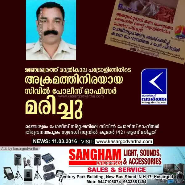 മഞ്ചേശ്വരത്ത് രാത്രികാല പട്രോളിങ്ങിനിടെ അക്രമത്തിനിരയായ സിവില് പോലീസ് ഓഫീസര് മരിച്ചു
