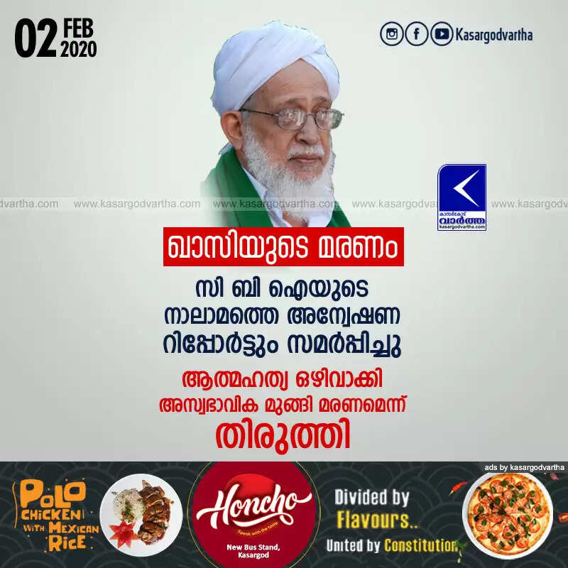 ഖാസിയുടെ മരണം: സി ബി ഐയുടെ നാലാമത്തെ അന്വേഷണ റിപ്പോര്ട്ടും സമര്പ്പിച്ചു; ആത്മഹത്യ ഒഴിവാക്കി അസ്വഭാവിക മുങ്ങി മരണമെന്ന് തിരുത്തി