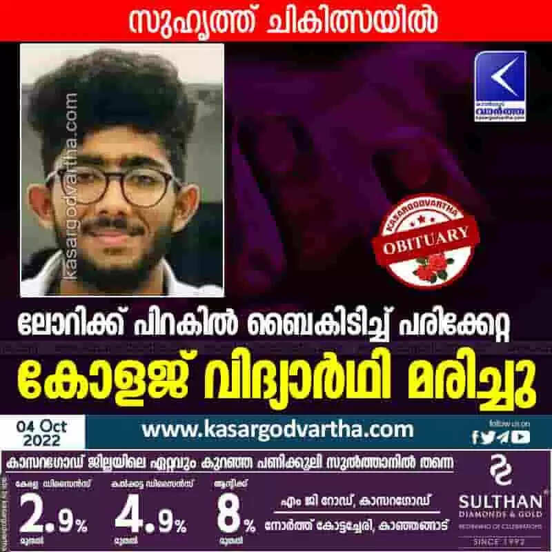 Student died | ലോറിക്ക് പിറകില്‍ ബൈകിടിച്ച് പരിക്കേറ്റ കോളജ് വിദ്യാര്‍ഥി മരിച്ചു