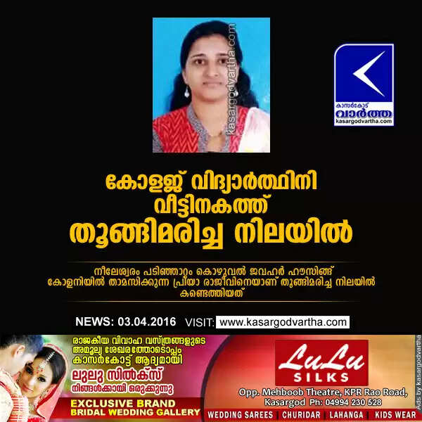 നീലേശ്വരം: (www.kasargodvartha.com 03.04.2016) കോളജ് വിദ്യാര്‍ത്ഥിനിയെ വാടക വീട്ടില്‍ തൂങ്ങിമരിച്ച നിലയില്‍ കണ്ടെത്തി. കണ്ണൂര്‍ സര്‍വകലാശാല നീലേശ്വരം ക്യാംപസിലെ എം എ മലയാളം രണ്ടാം സെമസ്റ്റര്‍ വിദ്യാര്‍ത്ഥിനി പ്രിയാ രാജീവിനെയാണ് (31) പടിഞ്ഞാറ്റം കൊഴുവല്‍ ജവഹര്‍ ഹൗസിങ്ങ് കോളനിയിലെ വാടക വീട്ടില്‍ മരിച്ച നിലയില്‍ കണ്ടത്.