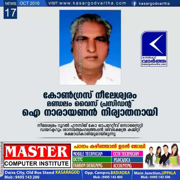 Keywords : Nileshwaram, Obituary, Congress, Leader, I Narayanan, Congress leader I Narayanan passes away.