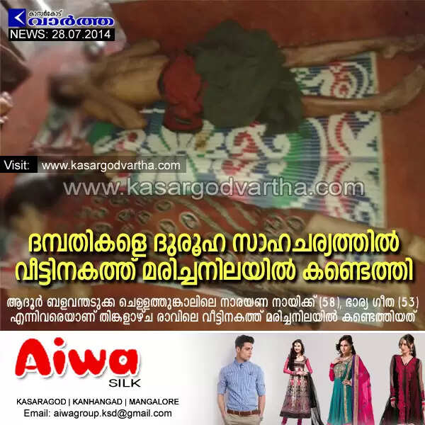 മുള്ളേരിയ: (www.kasargodvartha.com 28.07.2014) ദമ്പതികളെ ദുരൂഹസാഹചര്യത്തില്‍ വീട്ടിനകത്ത് മരിച്ചനിലയില്‍ കണ്ടെത്തി. ആദൂര്‍ ബളവന്തടുക്ക ചെള്ളത്തുങ്കാലിലെ നാരയണ നായിക്ക് (58), ഭാര്യ ഗീത (53) എന്നിവരെയാണ് തിങ്കളാഴ്ച രാവിലെ വീട്ടിനകത്ത് മരിച്ചനിലയില്‍ കണ്ടെത്തിയത്. വീടിന്റെ വാതില്‍ തുറക്കാത്തതിനെതുടര്‍ന്ന് നടത്തിയ അന്വേഷണത്തിലാണ് ഇരുവരേയും വീട്ടിനകത്ത് മരിച്ചനിലയില്‍ കണ്ടെത്തിയത്. നിലത്ത് പായയില്‍ മലര്‍ന്ന് കിടക്കുന്ന നിലയിലായിരുന്നു നാരായണ നായിക്കിന്റെ മൃതദേഹം. കമിഴ്ന്ന് കിടക്കുകയായിരുന്നു ഗീത.